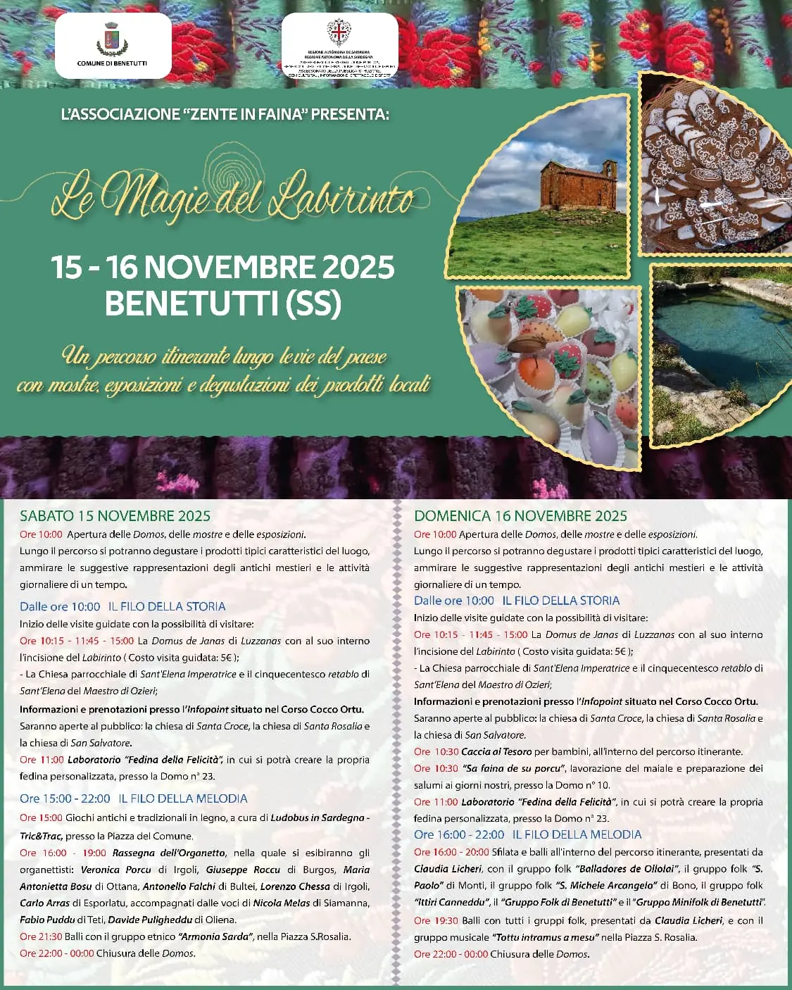 Si rinnova a Benetutti l'appuntamento “Le Magie del Labirinto”. Il 15 e 16 novembre 2025 lo storico borgo del Goceano si trasforma in un affascinante percorso itinerante tra le vie del centro, grazie alla manifestazione organizzata dall’associazione "Zente in Faina" con il patrocinio del Comune di Benetutti e della Regione Sardegna. Due giornate all’insegna della cultura, delle tradizioni e dei prodotti locali, in cui mostre, esposizioni, degustazioni e musica si intrecciano, aprendo ai visitatori un mondo di profumi e sapori, arti e mestieri della comunità benetuttese.