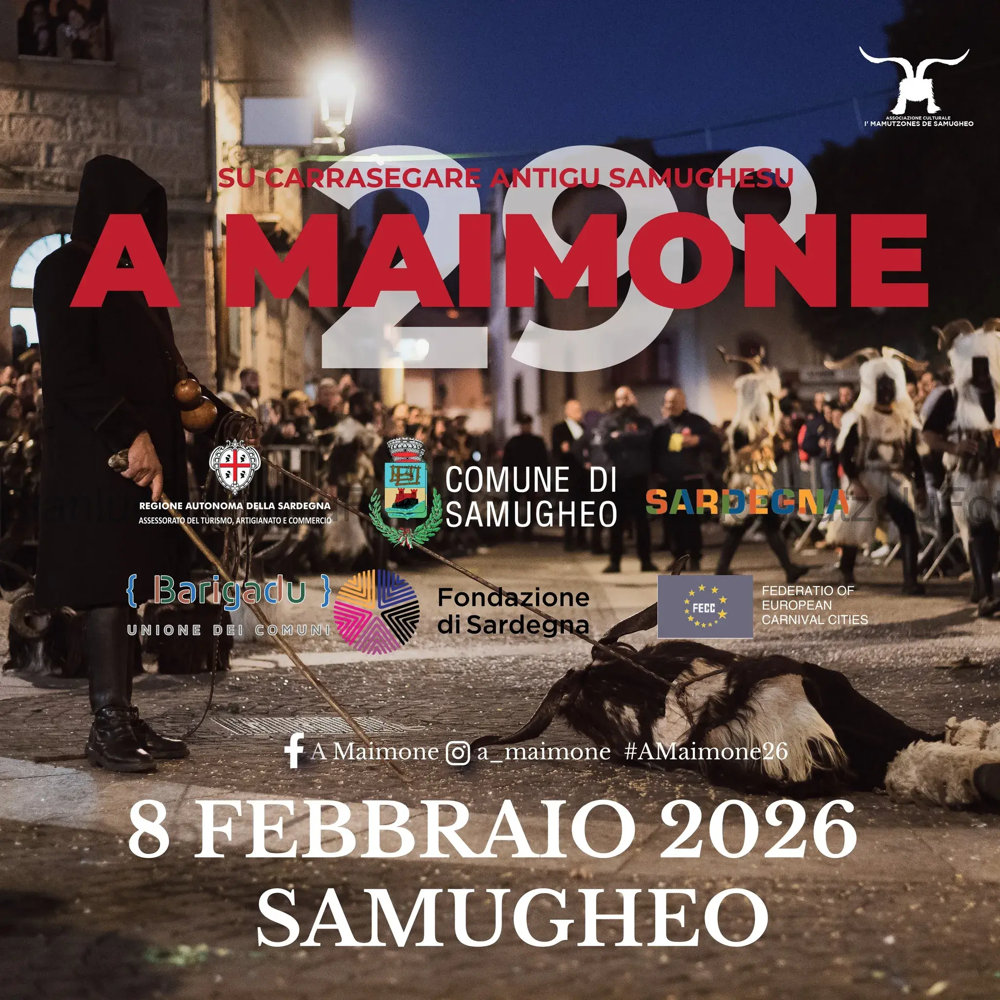 A organizzare la rassegna è l’Associazione Culturale Mamutzones de Samugheo, custode e interprete di una tradizione che affonda le radici nella storia e nell’identità del paese. "A Maimone" non è soltanto un evento spettacolare, ma un rito collettivo che coinvolge l’intera comunità: abitanti, figuranti, volontari e visitatori diventano parte di un’esperienza condivisa, in cui il confine tra pubblico e rappresentazione si assottiglia fino a scomparire.