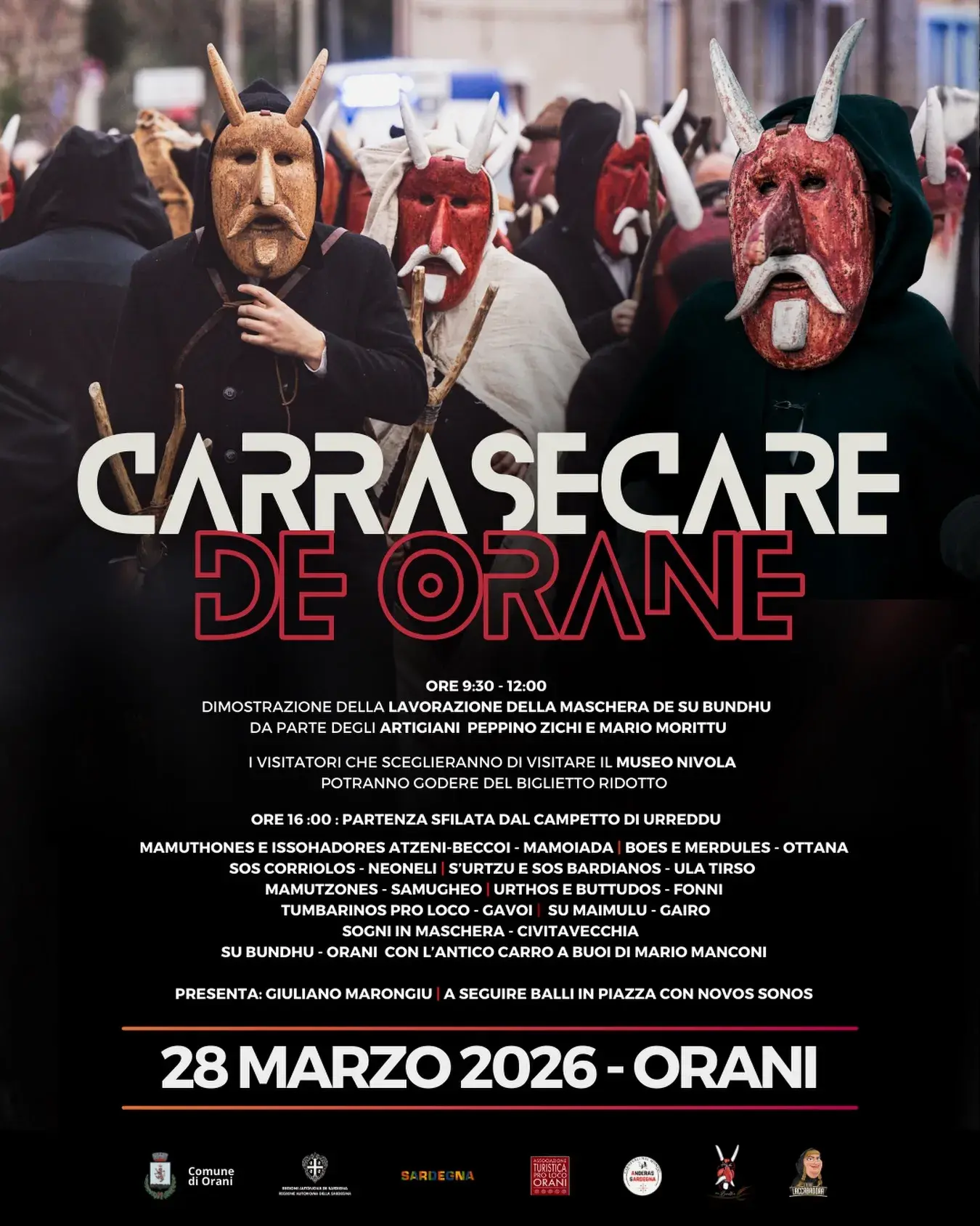La mattina, dalle 9:30 alle 12:00, si terrà la dimostrazione della lavorazione della maschera de Su Bundhu a cura degli artigiani Peppino Zichi e Mario Morittu, occasione preziosa per scoprire da vicino la manualità e il sapere che si celano dietro uno dei simboli identitari del paese. I visitatori che sceglieranno di visitare il Museo Nivola potranno usufruire del biglietto ridotto, in un dialogo ideale tra arte contemporanea e tradizione popolare.