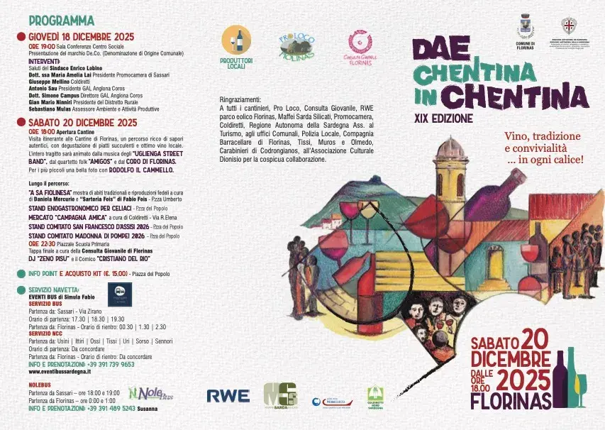 Florinas si prepara ad accogliere la XIX edizione di “Dae Chentina in Chentina”, l’evento enogastronomico itinerante che da anni rappresenta uno degli appuntamenti più attesi dalla comunità e dal territorio. La manifestazione, dedicata al vino, alla tradizione e alla convivialità, si svolgerà sabato 20 dicembre, coinvolgendo il centro storico del paese con un ricco calendario di iniziative.