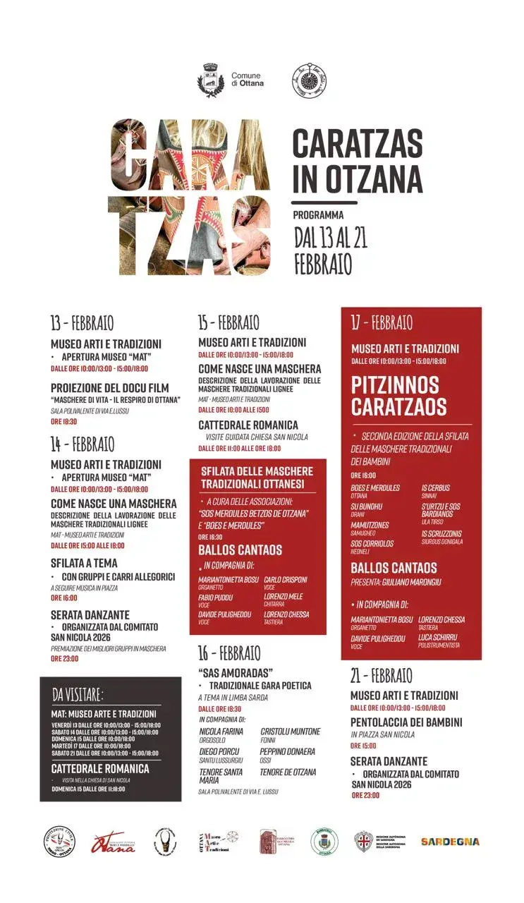 Ottana si prepara a vivere giorni di festa e identità con “Caratzas in Othana”, il calendario di eventi dedicati al Carnevale e alle maschere tradizionali, in programma dal 13 al 21 febbraio. Un cartellone che unisce cultura, artigianato, musica e spettacolo, coinvolgendo il centro del paese, il Museo MAT e la Cattedrale romanica di San Nicola.