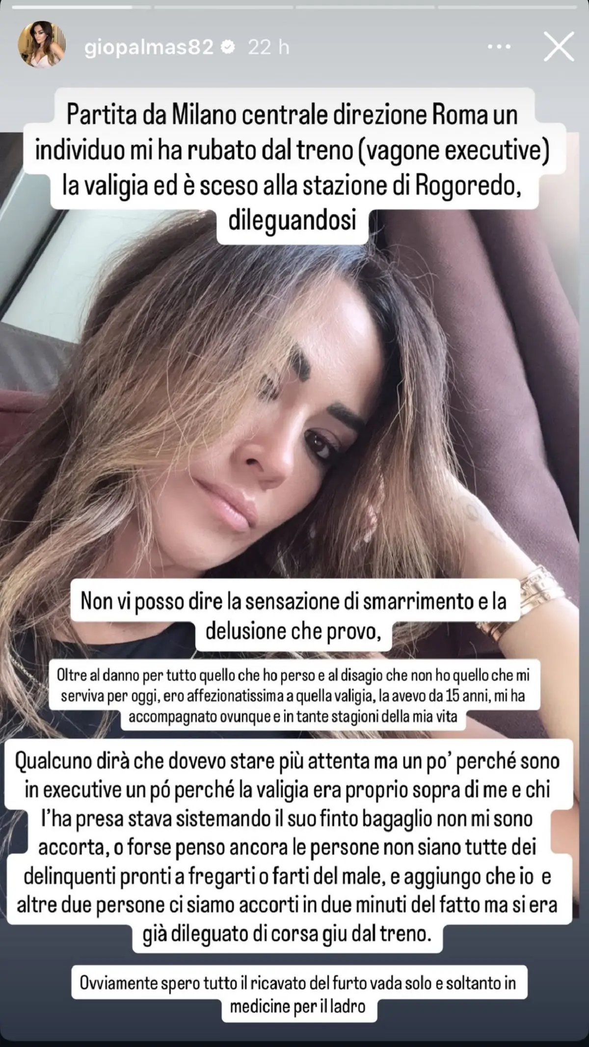 Brutta disavventura per Giorgia Palmas, showgirl sarda ed ex velina, che nelle scorse ore ha raccontato attraverso i suoi canali social di essere stata derubata a bordo di un treno ad alta velocità in viaggio da Milano a Roma.