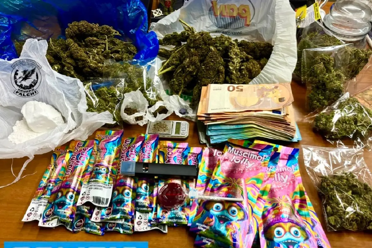 Durante la perquisizione a Decimomannu sono stati sequestrati 65 grammi di cocaina, 300 grammi di marijuana, 18 grammi di hashish e 0,62 grammi di MDMA. Accanto a queste, 14 sigarette elettroniche già caricate con liquidi contenenti droghe sintetiche e sei lecca-lecca arricchiti con sostanze psicotrope, verosimilmente destinati a un pubblico giovanile. A completare il quadro probatorio, il ritrovamento di 3.575 euro in contanti, ritenuti frutto dell’attività illecita, oltre al materiale per il confezionamento delle dosi.