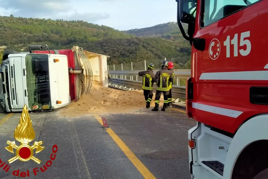 Un camion che trasportava sabbia si è ribaltato sulla strada statale 131, subito dopo le gallerie di Chighizzu. L'incidente che ha coinvolto il mezzo pesante, che viaggiava in direzione Cagliari, ha causato un blocco totale della strada.