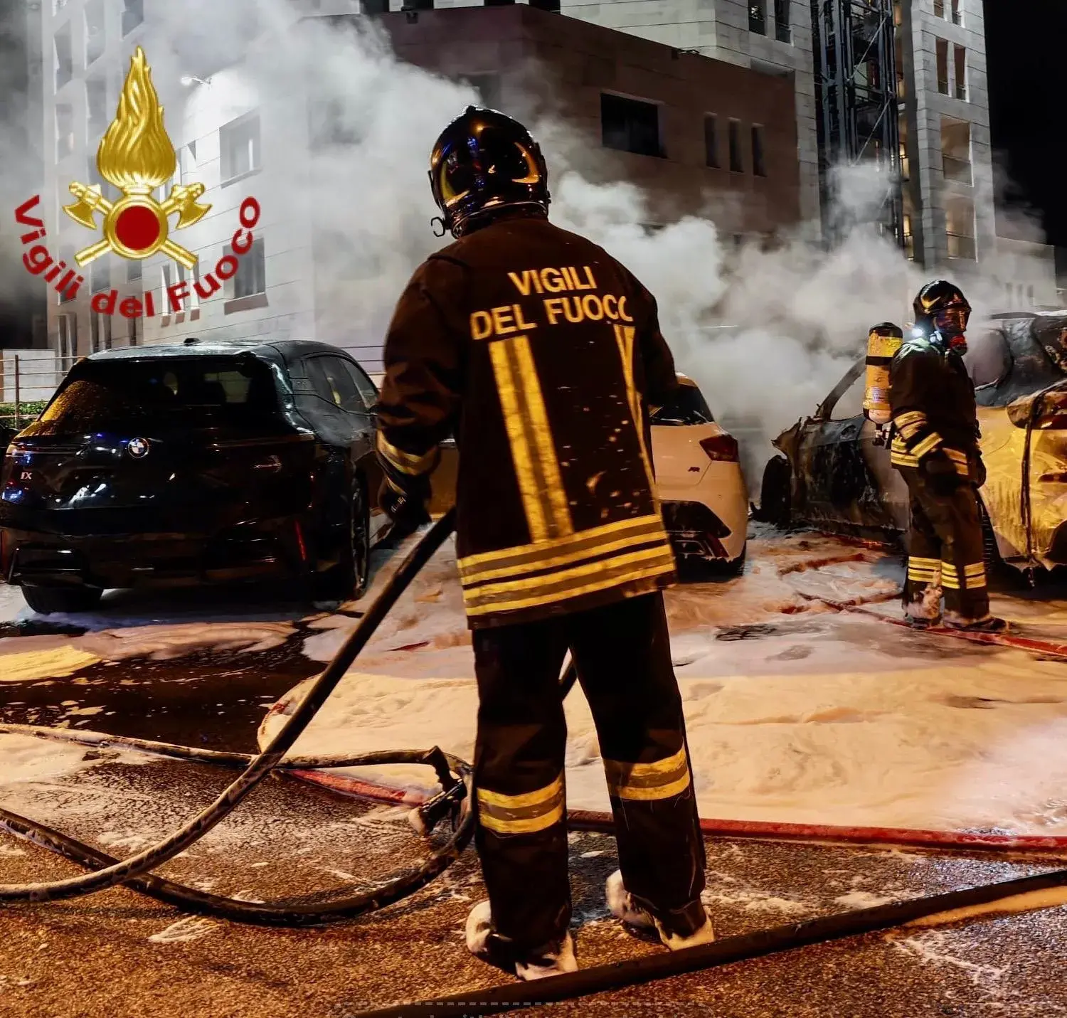 Giunti immediatamente sul posto, i Vigili del fuoco hanno spento le fiamme ed evitato che l'incendio si propagasse ulteriormente coinvolgendo anche le altre auto parcheggiate.