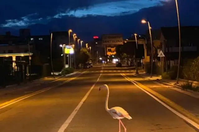 Un bellissimo scatto fotografico, quello di Mauro Marroccu e diffuso su fb da Maria Paola Loi che in tempi del Covid-19, ritrae fedelmente come la natura si sta riprendendo i propri spazi. Città, strade e lungomare deserti, questo bellissimo fenicottero è dunque libero di passeggiare indisturbato sul viale Colombo a Quartu.
