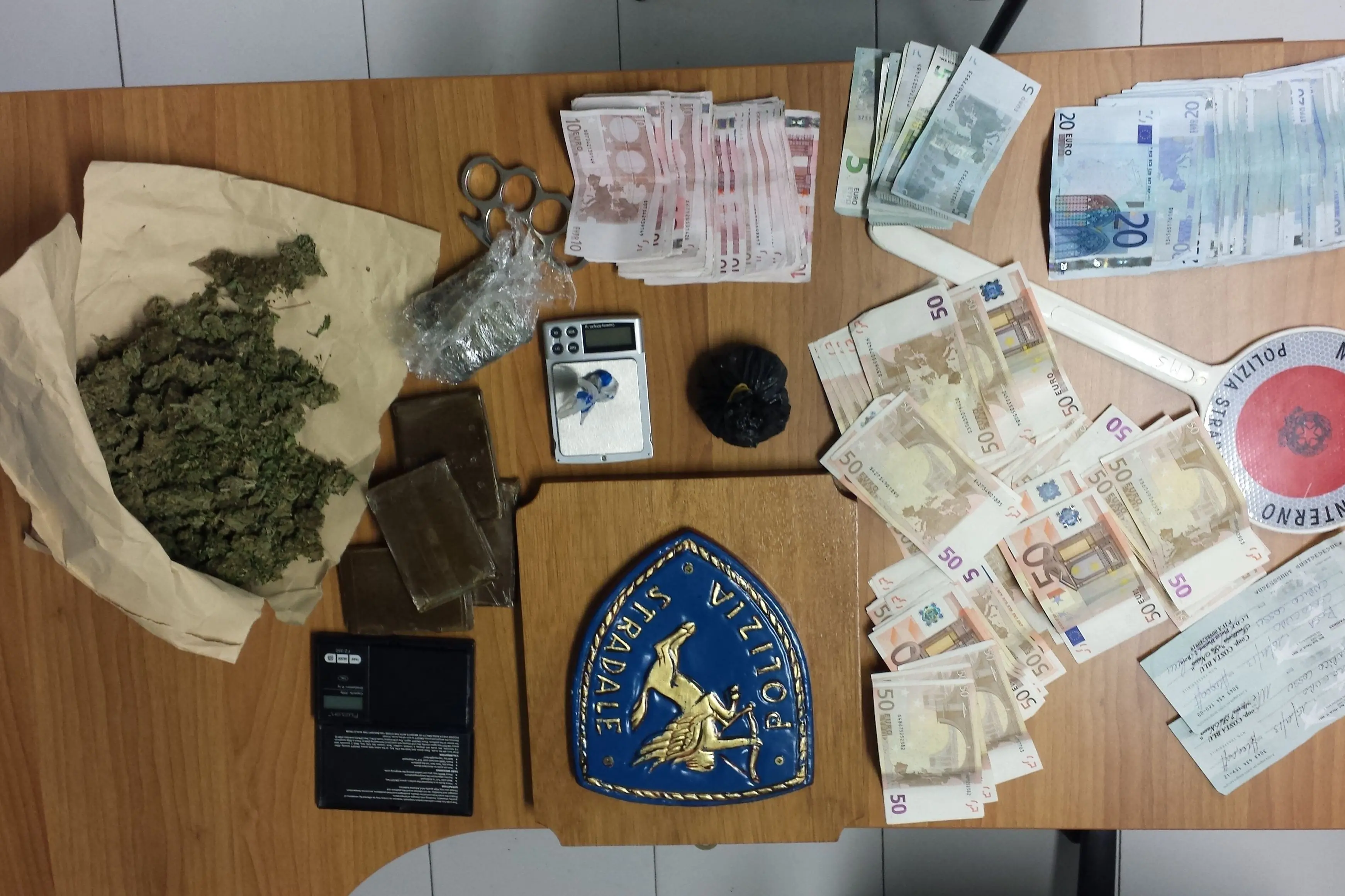 Durante la perquisizione del veicolo, rinvenivano all’interno del baule portabagagli, due buste di cellophane, una con con n.5 panetti di sostanza stupefacente del tipo hashish per un peso complessivo intorno ai 500 gr, l’altra contenente sostanza stupefacente del tipo marijuana per un peso di circa gr. 134.