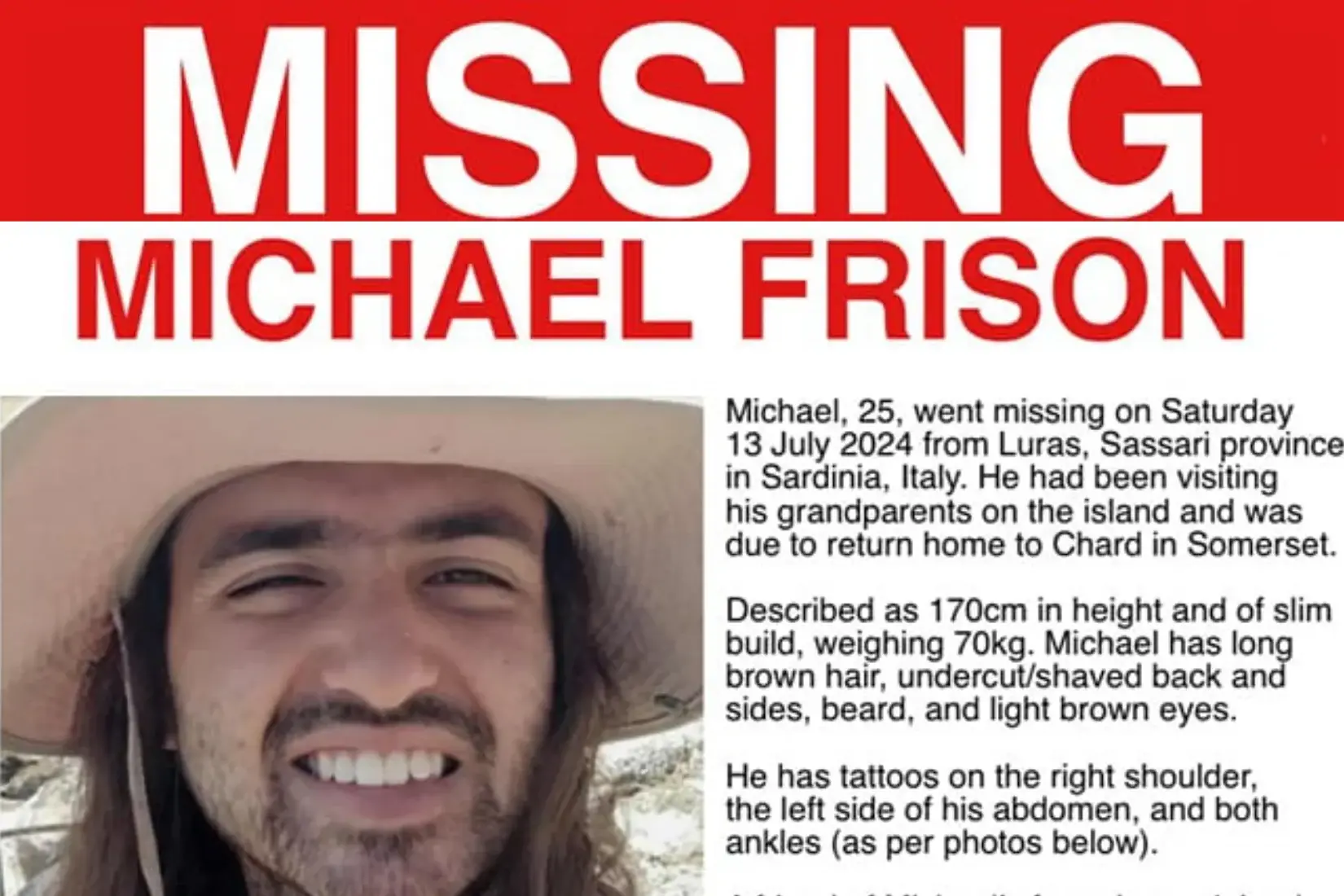 È passato ormai un anno e mezzo dalla scomparsa di Michael Frison, il 25enne inglese scomparso tra il 12 e il 13 luglio 2024 in Gallura, nelle campagne tra Luogosanto e Luras. Il giovane era arrivato in Sardegna il 2 luglio per fare visita ai nonni materni residenti a Sassari. Dieci giorni più tardi aveva raggiunto le campagne del nordest dell'Isola con un'amica scomparendo nel nulla.