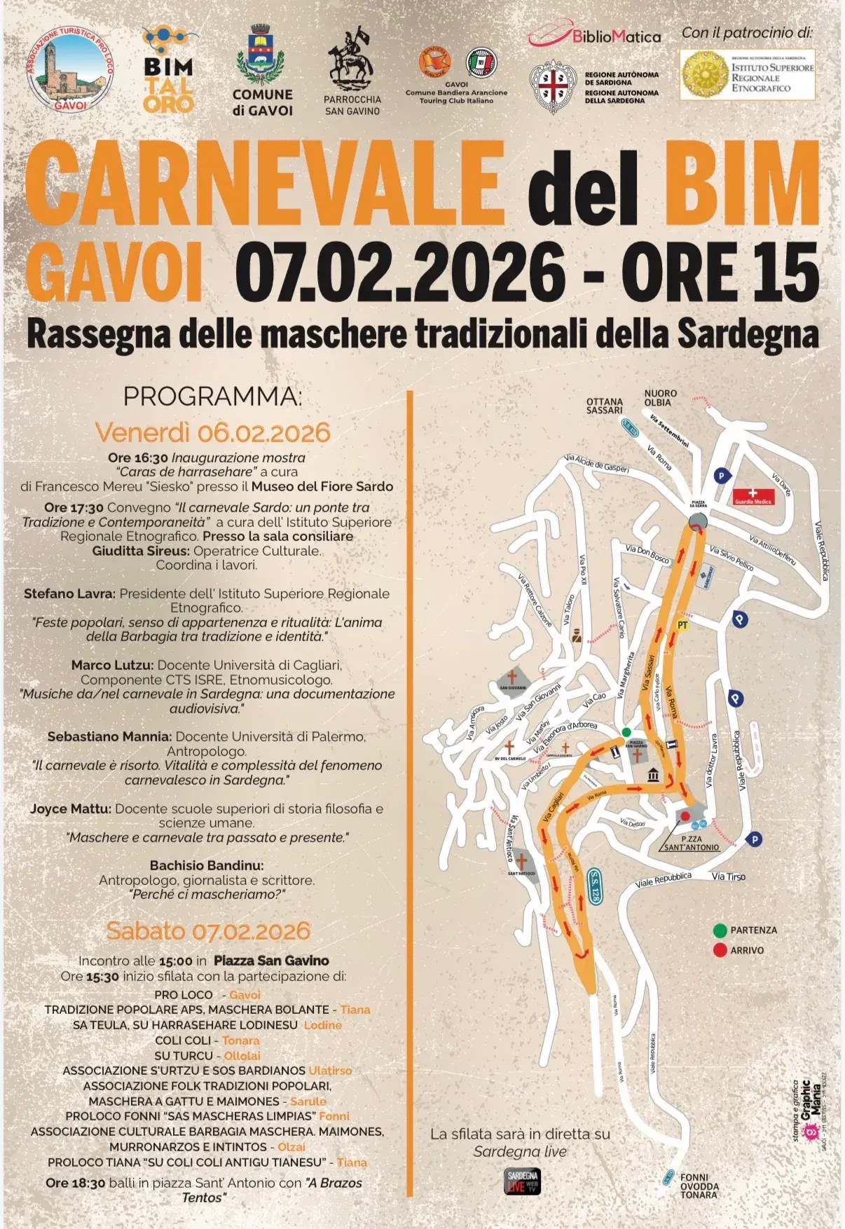 Alla sfilata parteciperanno diversi gruppi per uno scambio culturale vivo e autentico: la Pro loco "Sas Mascheras Limpias" di Fonni, l'Associazione "S’Urtzu e Sos Bardianos" di Ula Tirso, "Sa Teula", "Su Harrasehare Lodinesu" di Lodine, Tradizione Popolare APS, Maschera Bolante di Tiana, Coli Coli di Tonara, Su Turcu di Ollolai, l'Associazione Culturale "Barbagia Maschera" (Maimones, Murronarzos e Intintos) di Olzai, l'"Associazione Folk Tradizioni Popolari" (Maschera a Gattu e Maimones) di Sarule, la Pro loco "Su Coli Coli Antigu Tianesu" di Tiana, e AT Pro loco, Tumbarinos di Gavoi.