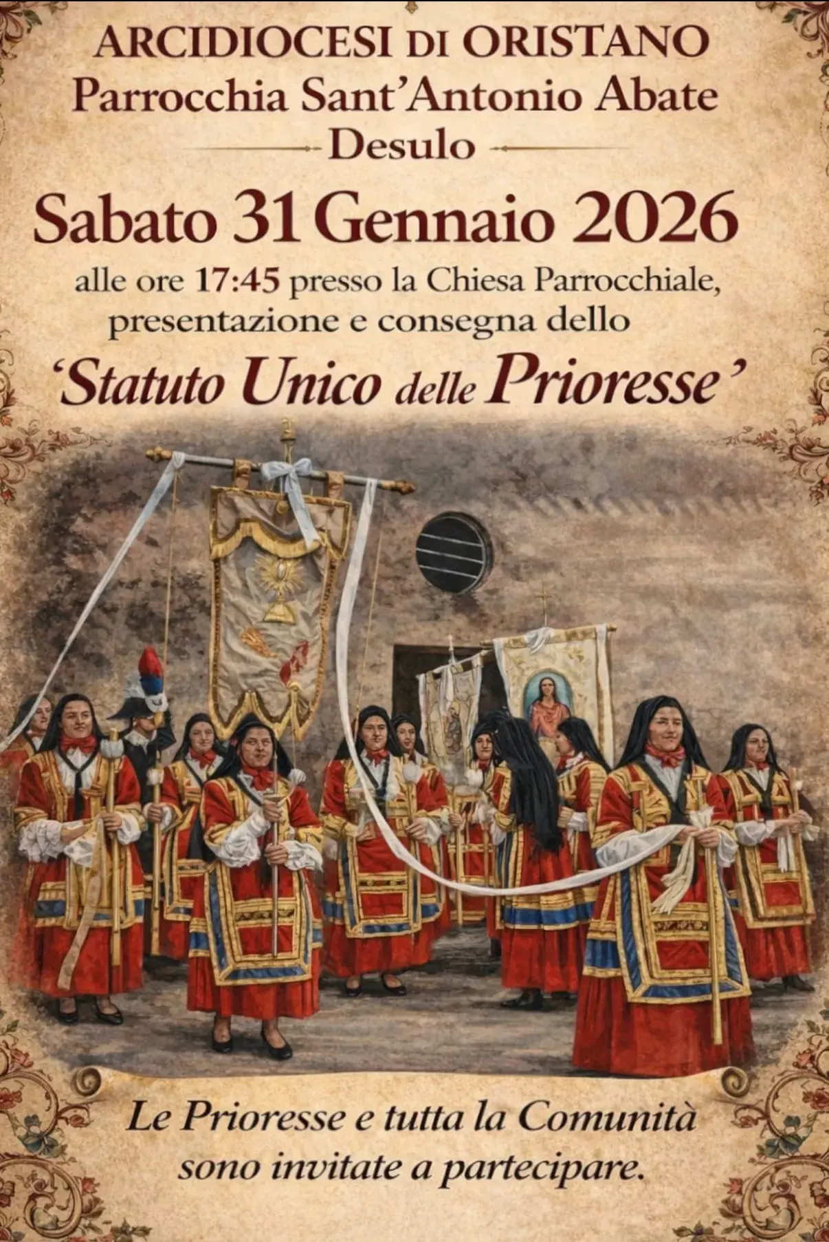 Momenti di grande emozione e di profondo valore religioso, culturale e identitario per l’intera comunità desulese, quelli che sono stati vissuti lo scorso sabato, 31 gennaio, presso la Chiesa Parrocchiale di Sant’Antonio Abate a Desulo, dove si sono svolte la presentazione ufficiale e la consegna dello Statuto Unico delle Prioresse.
