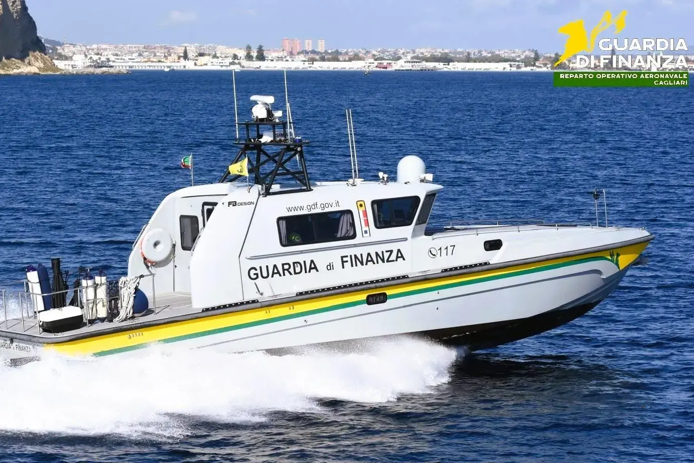 Realizzata dal cantiere FB Design di Annone Brianza, la vedetta si distingue per dimensioni e prestazioni: lunga 16 metri e larga oltre 4, è equipaggiata con moderne strumentazioni di navigazione, comunicazione e scoperta. Il cuore tecnologico è rappresentato da due propulsori FPT a sei cilindri in linea di nuova generazione, capaci di sviluppare una potenza complessiva di 1.900 cavalli e di spingere l’unità fino a una velocità massima di 54 nodi, pari a circa 100 km/h.