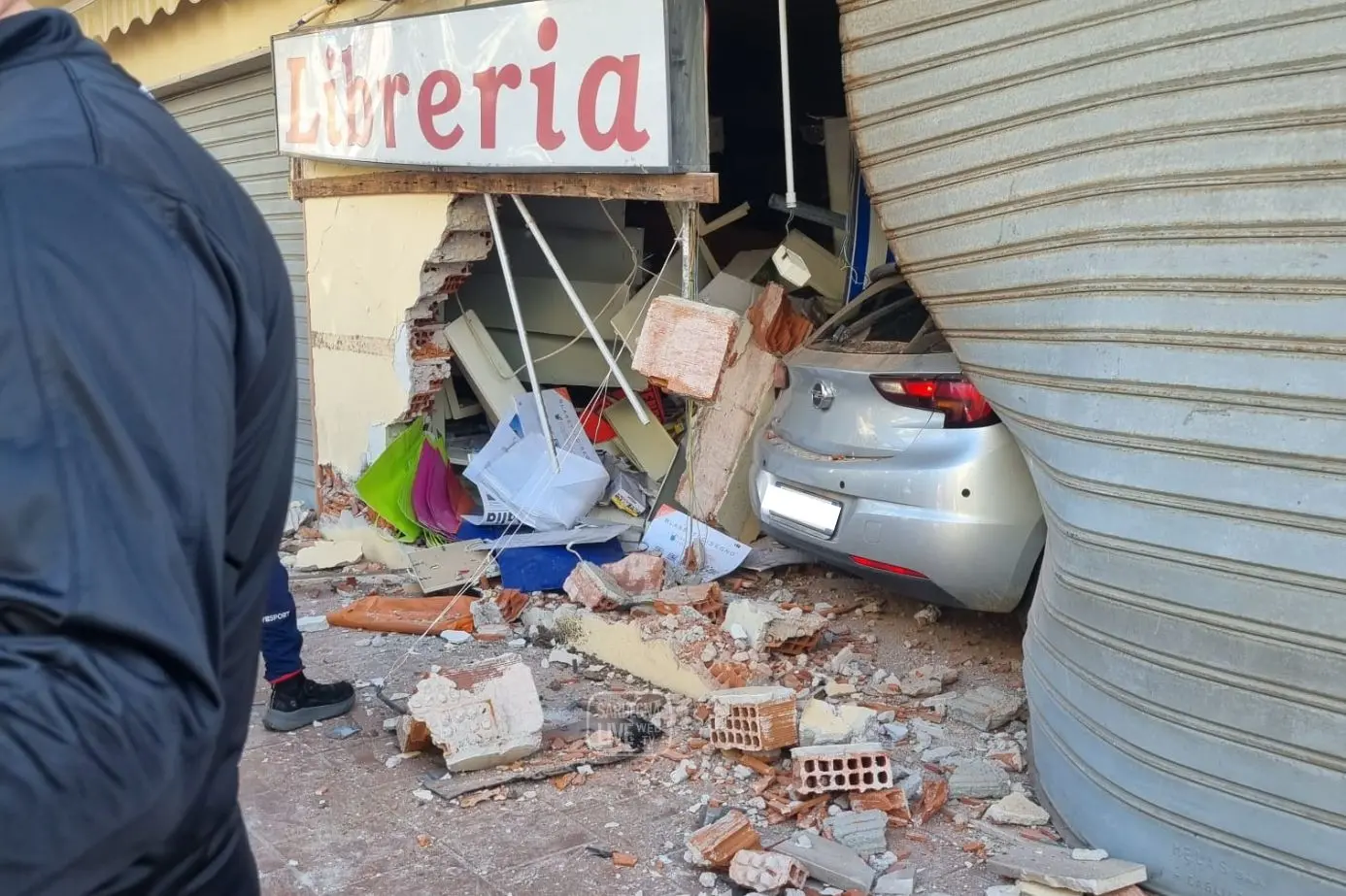 Secondo una prima ricostruzione e per cause in corso di accertamento, il conducente ha perso il controllo del mezzo dopo aver attraversato un incrocio urtando contro la facciata del negozio. L’impatto ha distrutto parte della struttura e provocato gravi danni all’interno, con scaffali, libri e materiali completamente travolti.