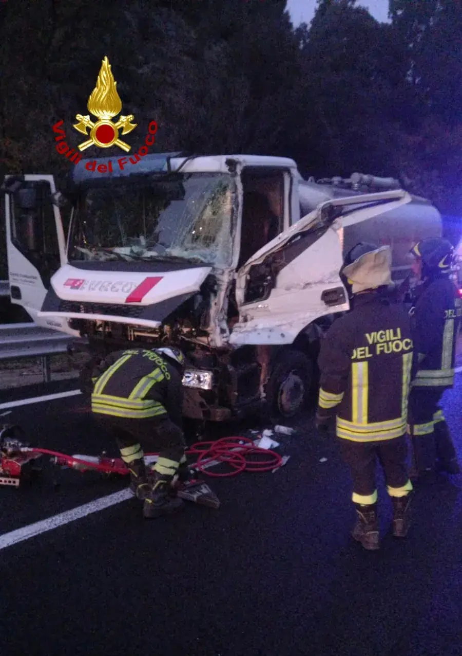 Terribile scontro frontale tra due camion sulla SS131 D.C.N. dopo le gallerie di Prato Sardo, le cui cause sono in fase di accertamento.