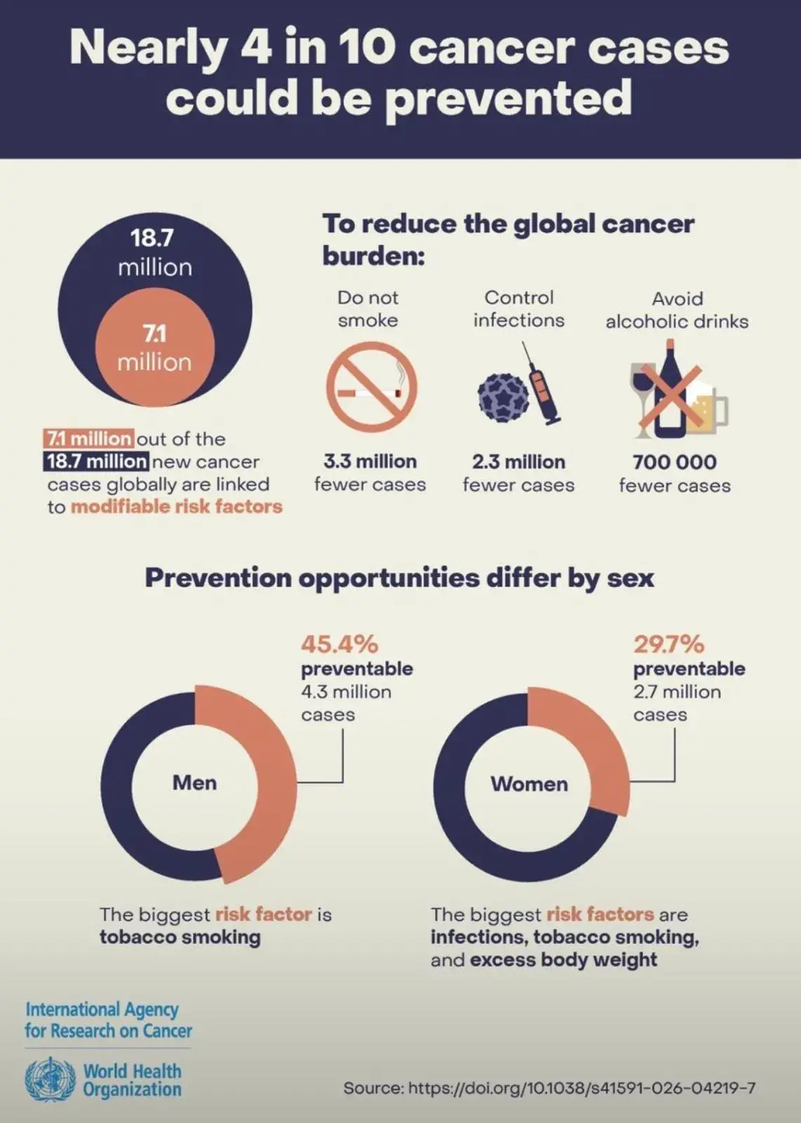 Il 40% dei casi di tumore potrebbe essere evitato, secondo uno studio condotto dall'Organizzazione Mondiale della Sanità e dall'Agenzia Internazionale per la Ricerca sul Cancro (IARC). Fumo, infezioni e consumo di alcol sono stati identificati come i principali fattori di rischio, pubblicato in occasione della Giornata Mondiale contro il Cancro, per sottolineare l'importanza della prevenzione.