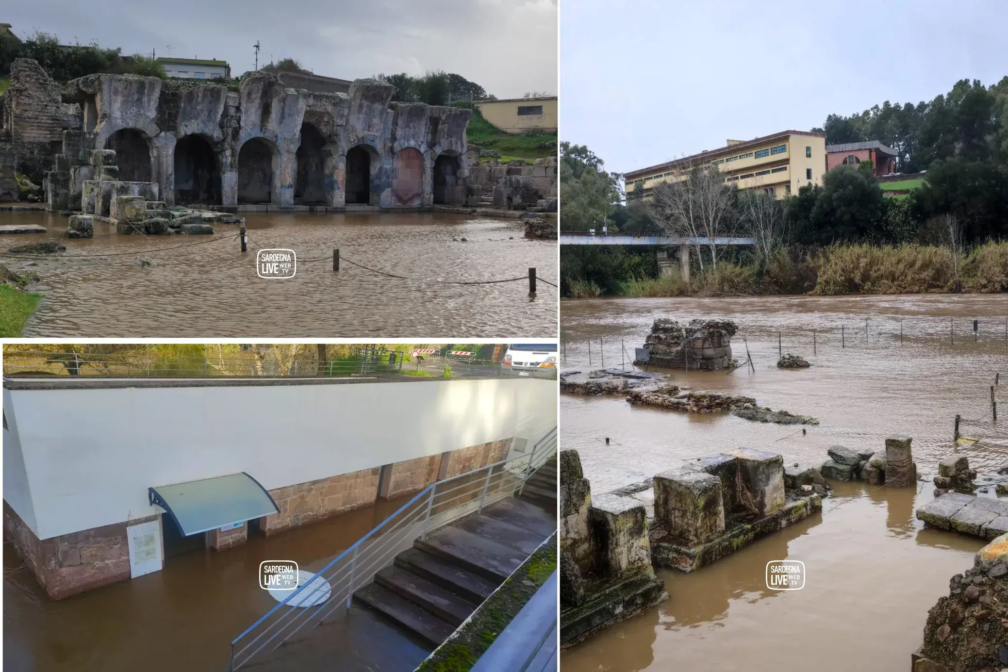 Le immagini mostrano il sito archeologico delle Antiche Terme Romane di Fordongianus circondato dall’acqua: il fiume Tirso, gonfio per le piogge persistenti, ha sommerso l’area termale - gestita dalla Società Cooperativa Forum Traiani - e le strutture circostanti.