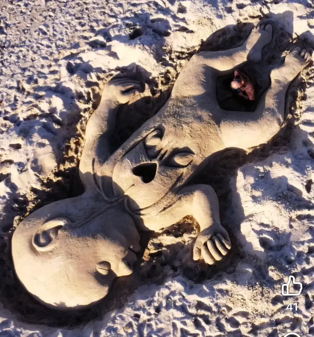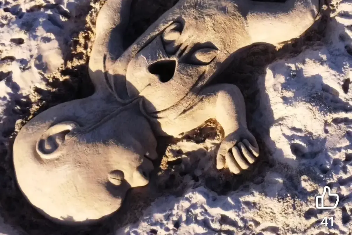 Una statua di sabbia raffigurante un bambino con un cuoricino ben visibile sul petto è l'ultima creazione dall'artista Nicola Urru sulla spiaggia di Platamona, in provincia di Sassari.