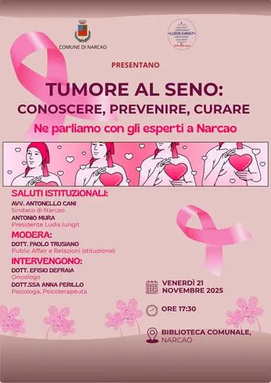 Un pomeriggio dedicato all’informazione, alla prevenzione e al sostegno psicologico. È quello che il Comune di Narcao, insieme all’associazione “Ludis Iungit”, propone per venerdì 21 novembre con il convegno “Tumore al seno: conoscere, prevenire, curare”, in programma alle 17:30 nella Biblioteca Comunale di vico I Marconi.