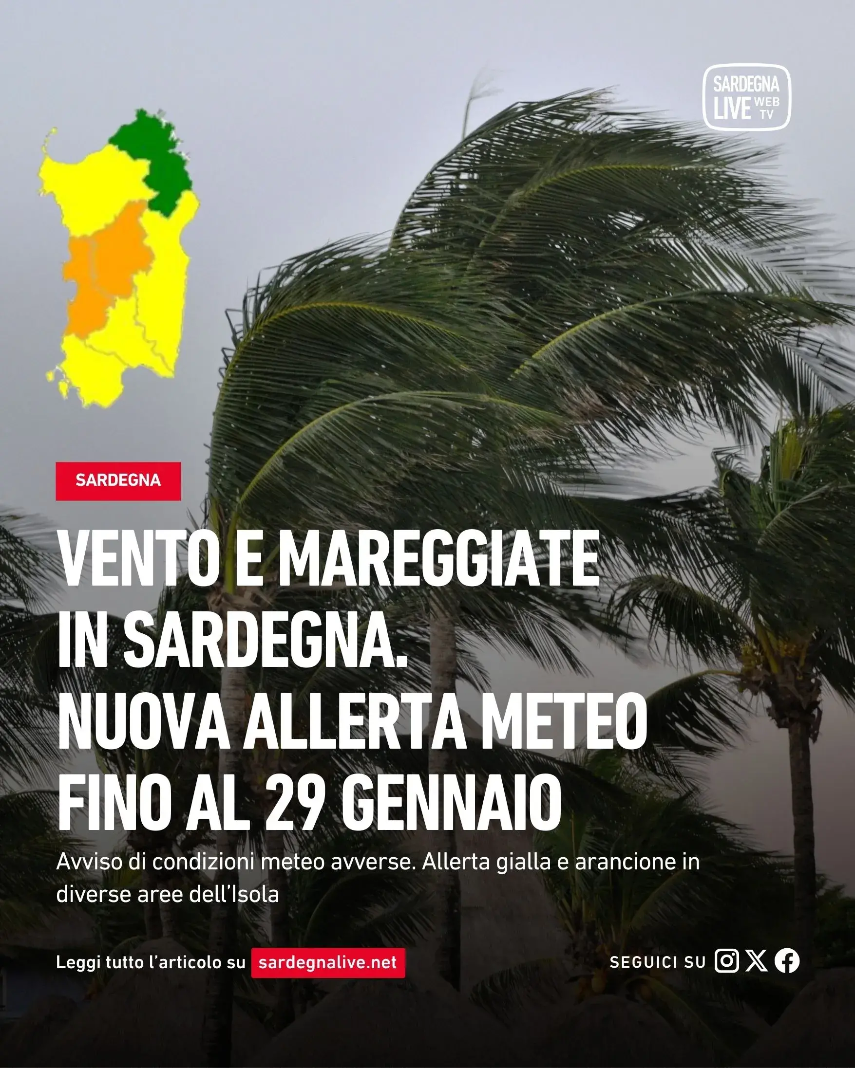 La Protezione civile regionale ha emanato un avviso di condizioni meteo avverse per la Sardegna, legato al transito di sistemi depressionari che interesseranno l’Isola tra mercoledì 28 e giovedì 29 gennaio. Il quadro meteo è caratterizzato da forti venti e mareggiate, con effetti più significativi lungo le coste occidentali e sui rilievi.