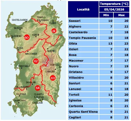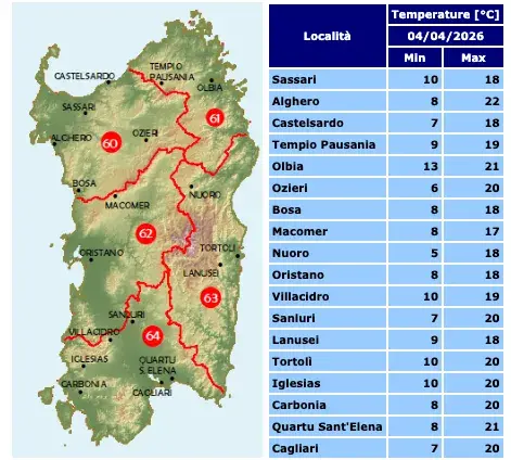 Cielo prevalentemente sereno, locali addensamenti in serata, specie sul Campidano. Temperature: minime stazionarie o in lieve calo , massime in generale aumento. Venti: deboli dai quadranti settentrionali, quasi calmi in serata. Mari: fino a molto mossi sui settori occidentali con moto ondoso in attenuazione , mossi altrove.